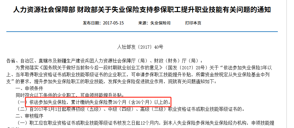 2017年人社部推出技能提升补贴政策(原文件:人社部发〔2017〕40号)