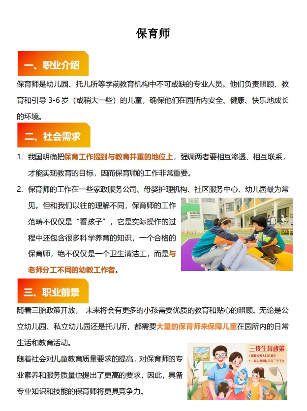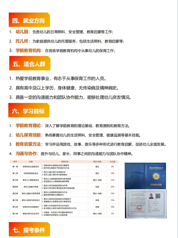 适合对象:1.热爱学前教育事业,有志于从事保育工作的人员。 2.具有高中及以上学历,身体健康,无传染病及精神病史。 3.具备一定的沟通能力和团队协作能力,能够处理幼儿突发情况。